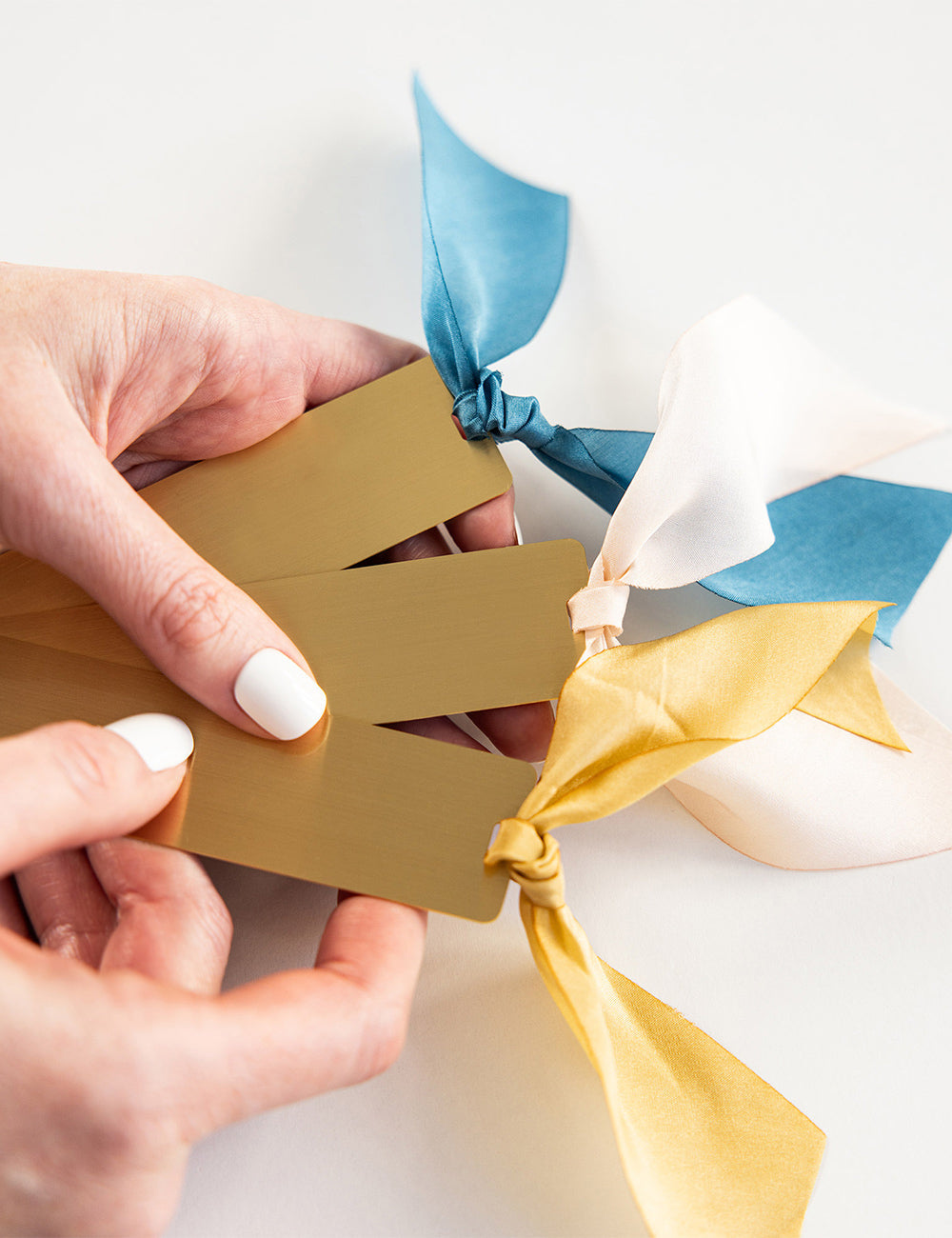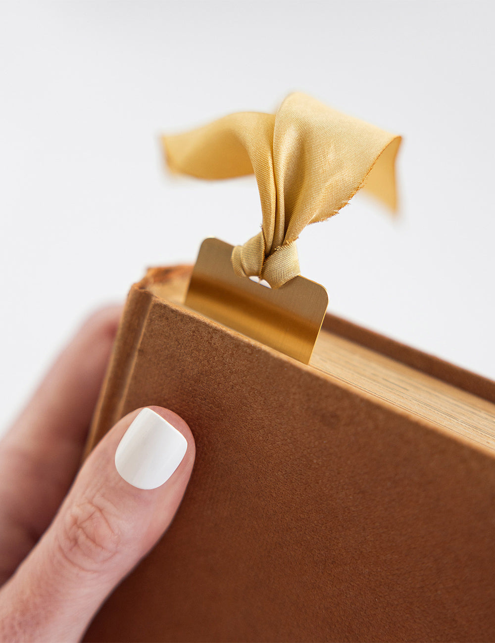 A solid brass and silk ribbon bookmark for saving a page when reading or productive journal planning