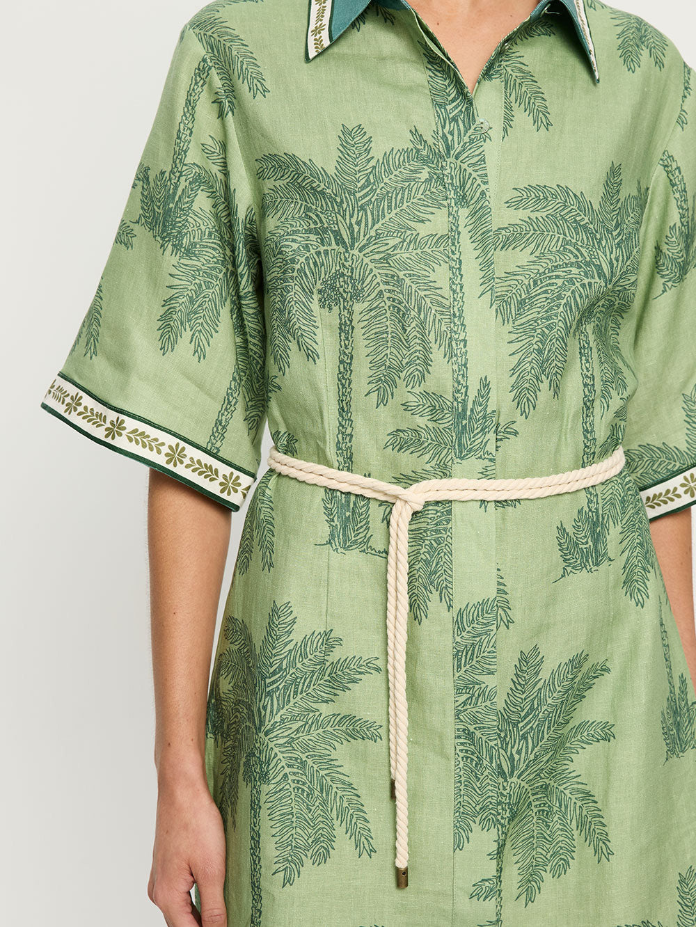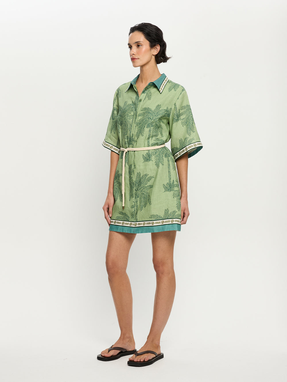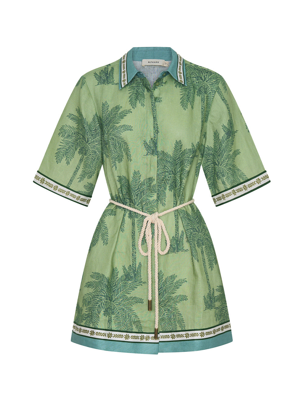Alani is a leafy botanical print featuring deep green palm trees scattered across a soft sage green base. The Alani Mini Shirt Dress is a relaxed fit featuring kimono style sleeves, signature buttons, contrast border print details. Featuring a button-through front and a removable waist tie, it offers a balance of ease and shape. Designed for warm days that drift into balmy evenings.