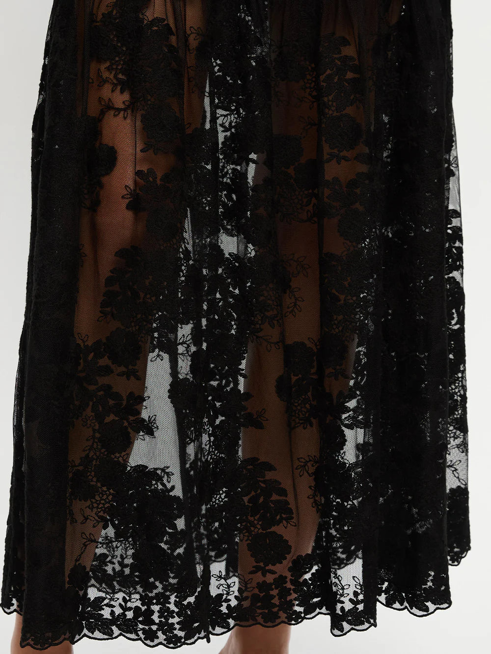 The Blaire Lace Maxi Skirt in black features an elasticated waist with drawcord and a sheer gathered lace hem frill complete with scalloped lace edging.