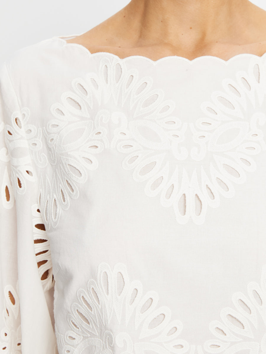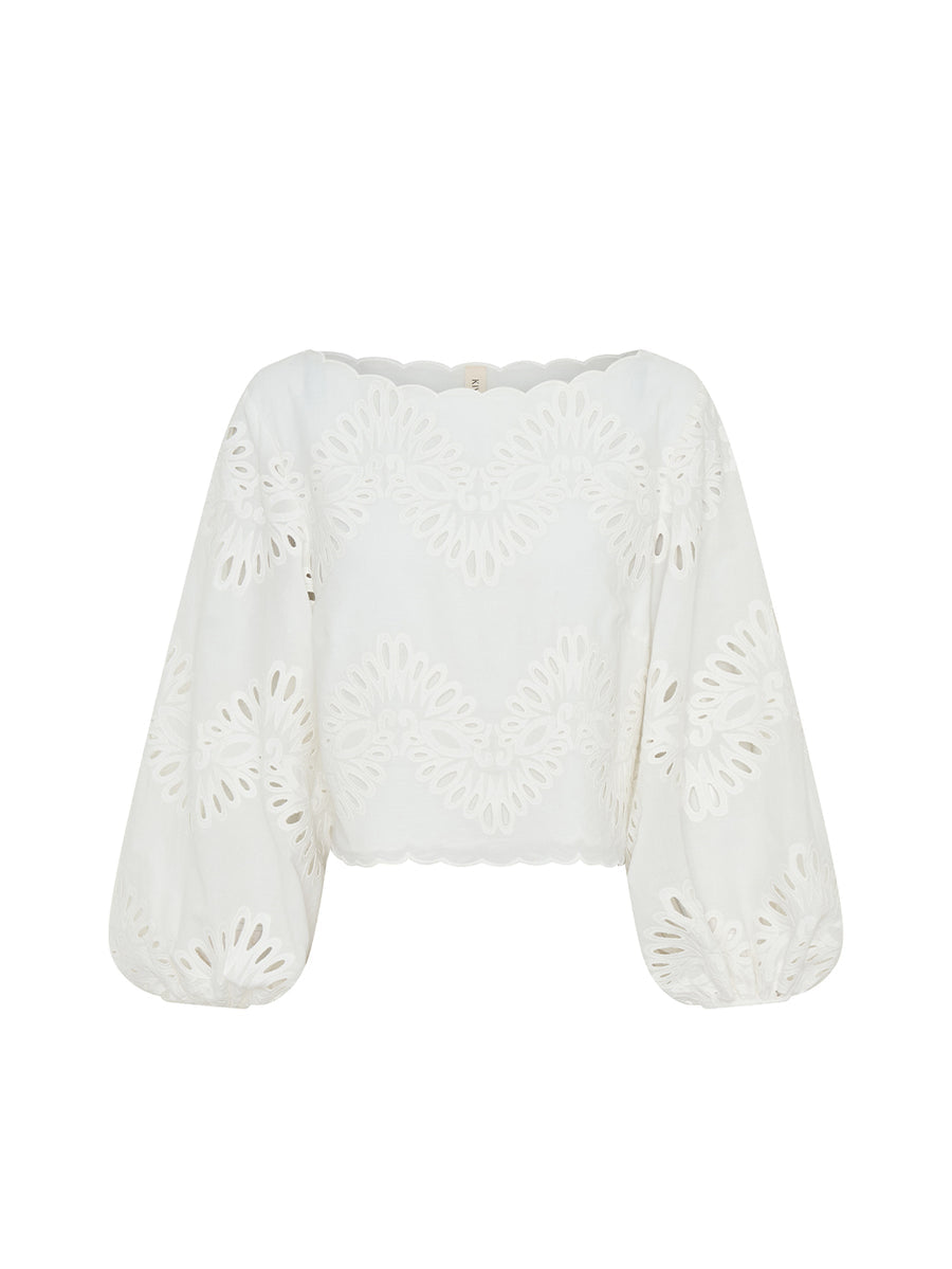 The Danielle Top is crafted from cotton broderie, featuring a wide boat neckline and long blouson sleeves, finished with a scalloped hem for a considered touch. Designed for light, effortless wear. Pair with the matching Danielle Mini Skirt for a coordinated look, or style with denim and sandals for easy daytime dressing.