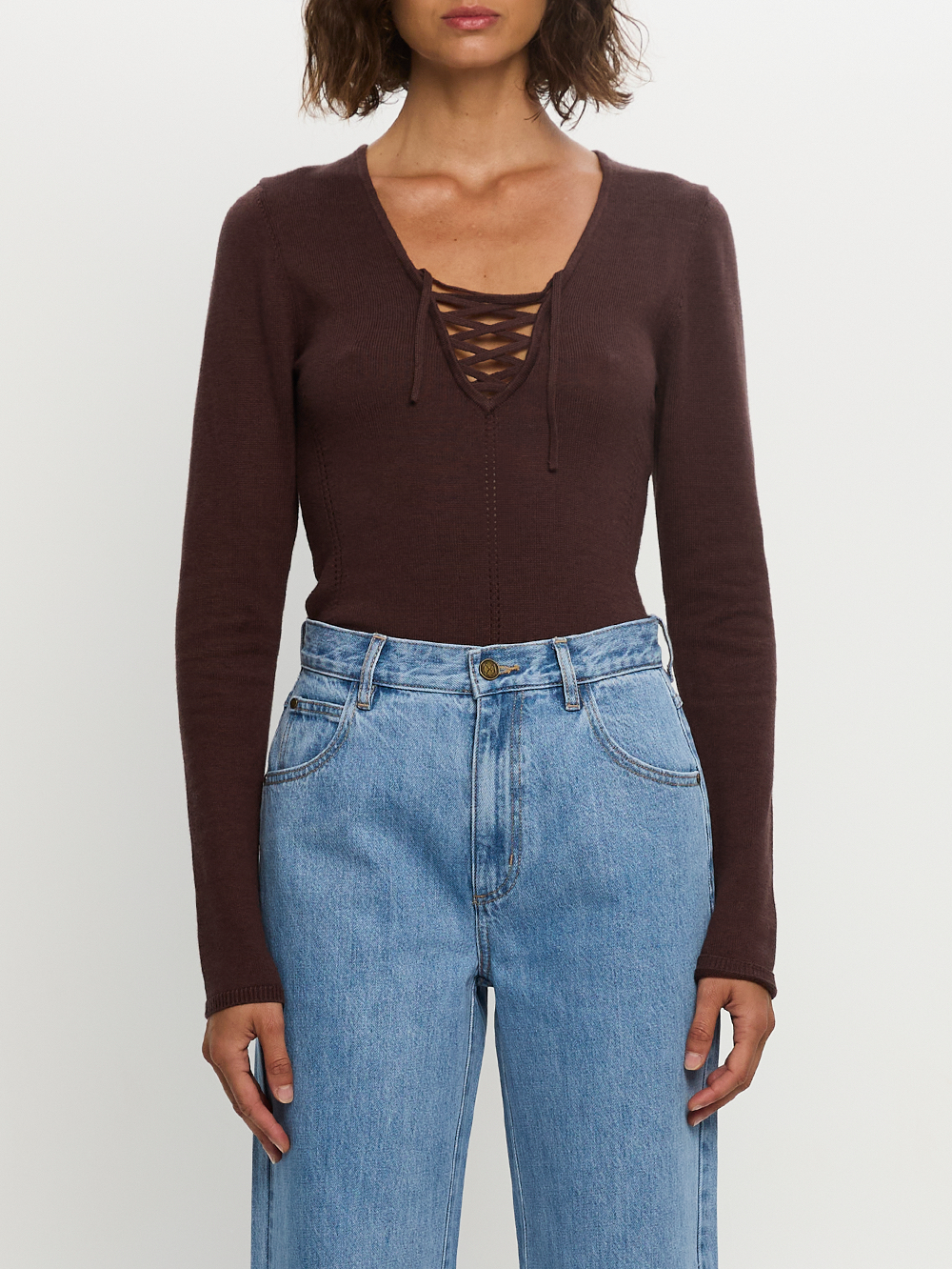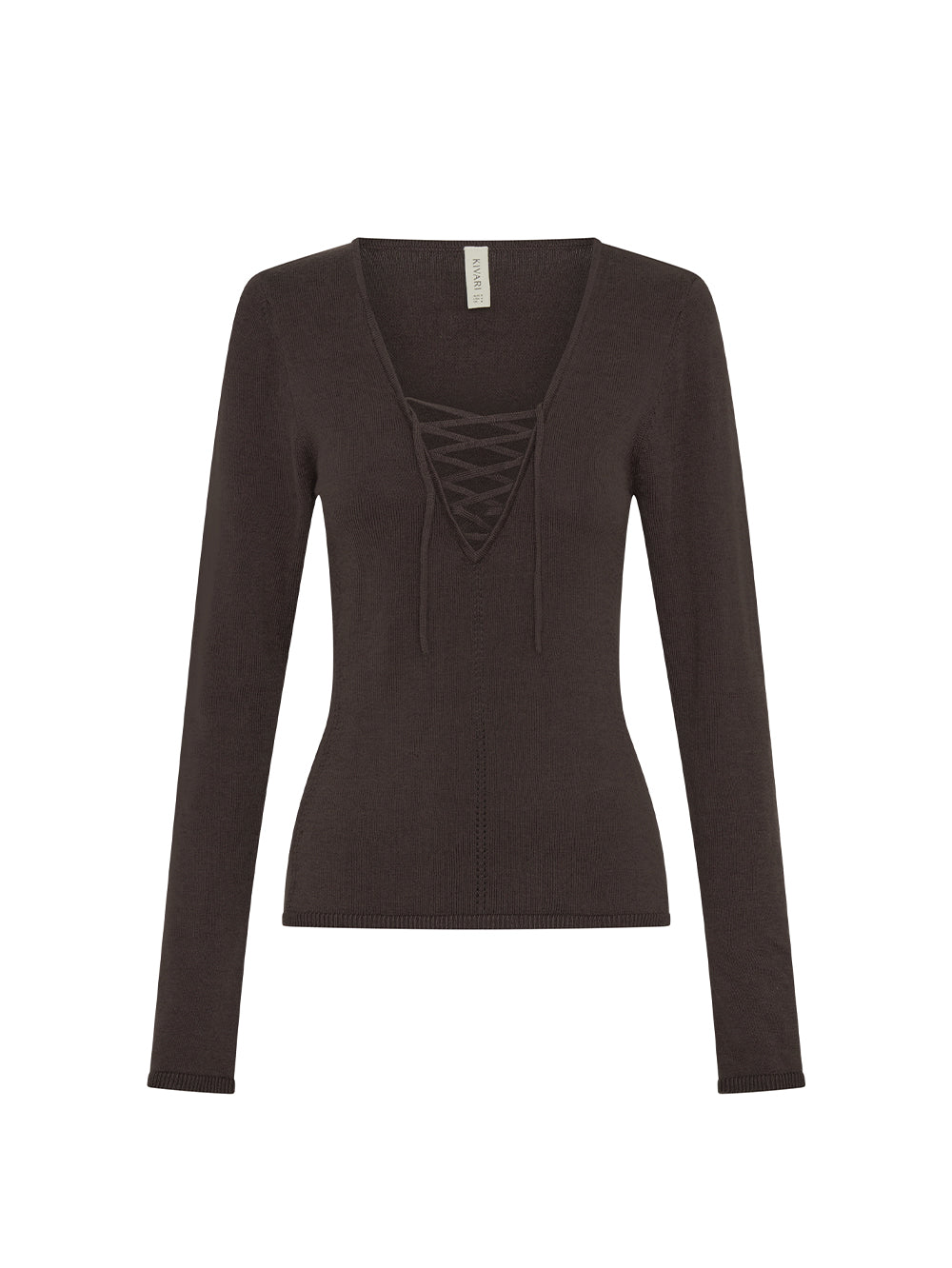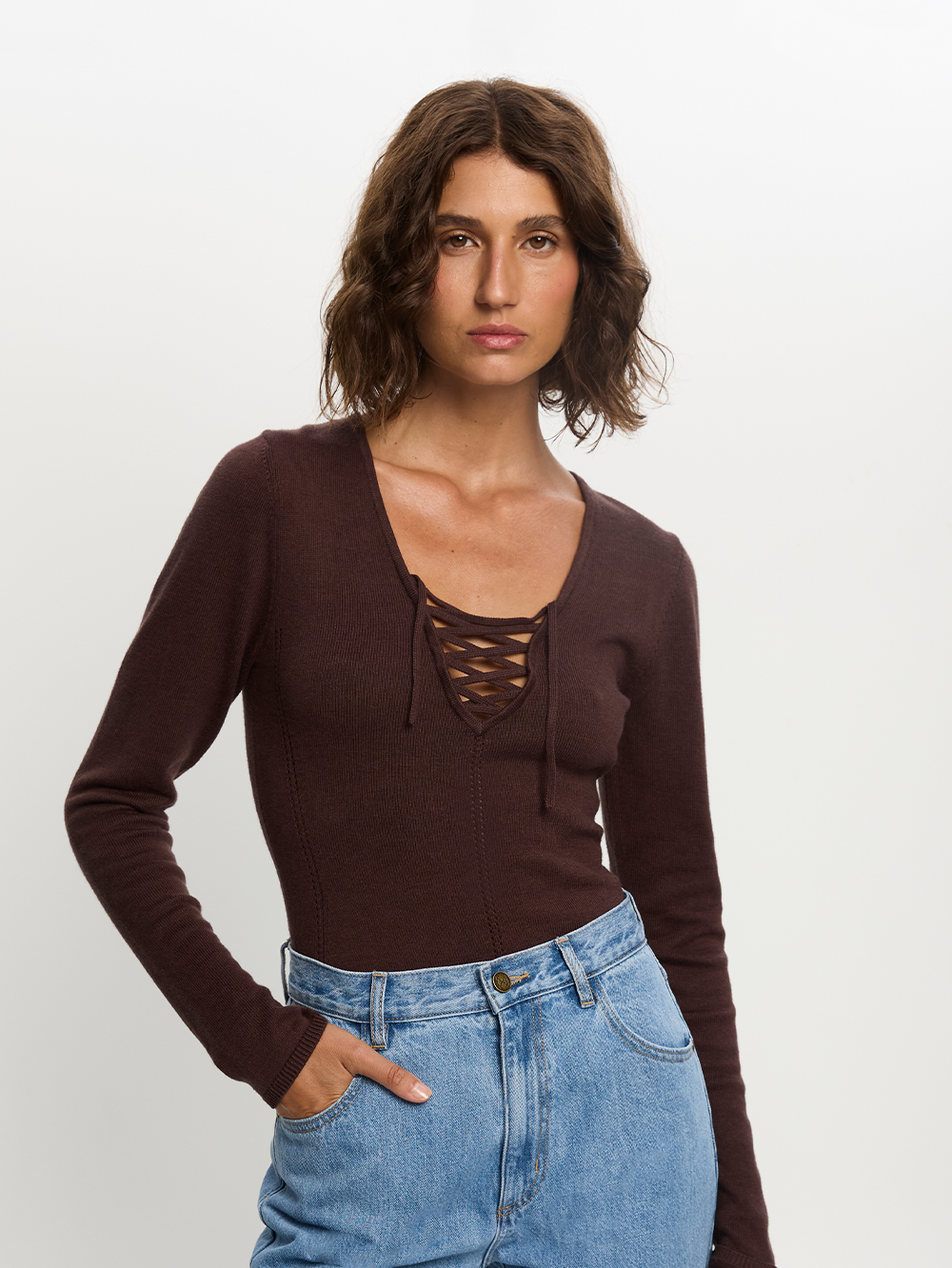 The Malia Knit Top in chocolate features slim fitted sleeves and V-neckline complete with lace up detailing.