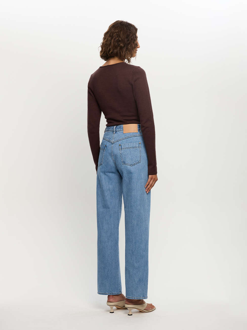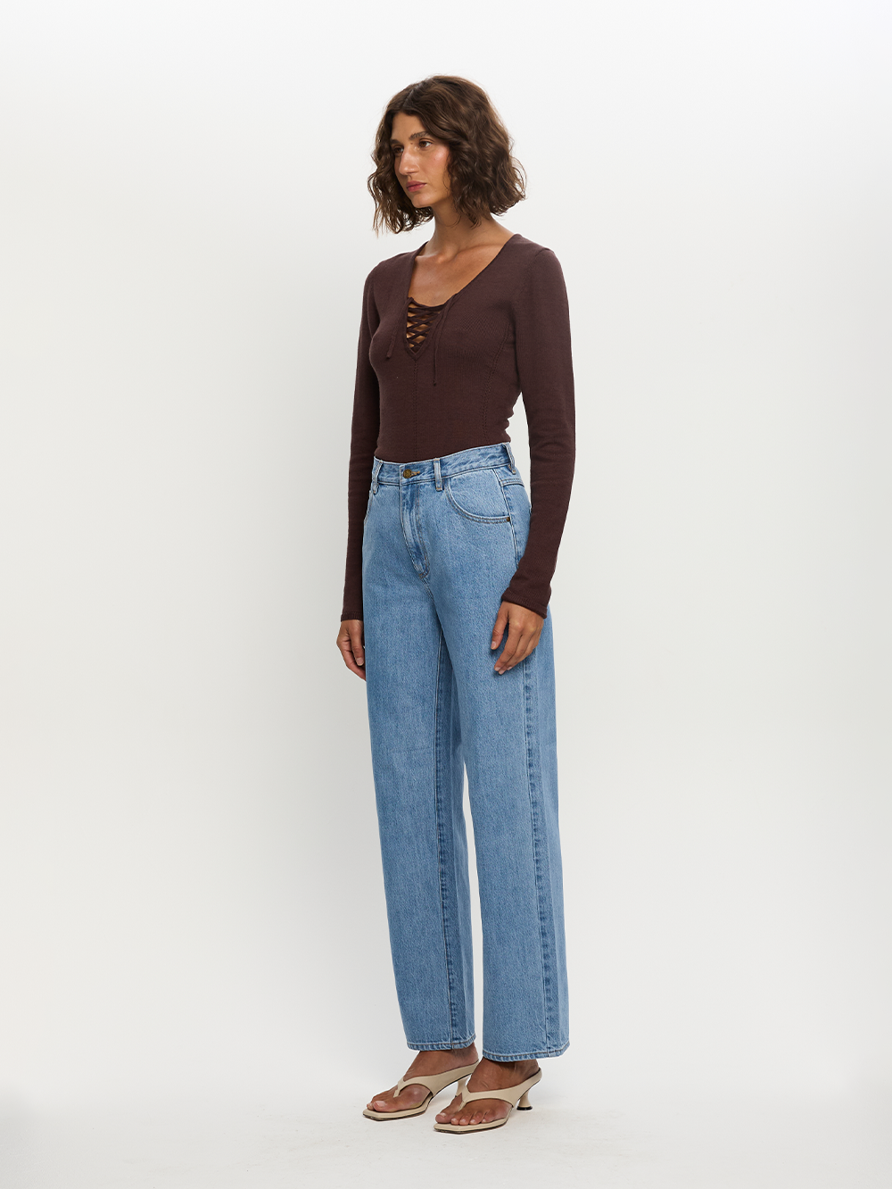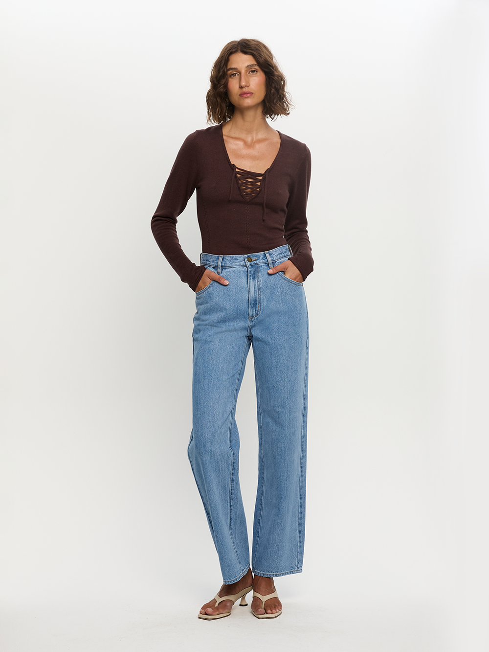 The Malia Knit Top in chocolate features slim fitted sleeves and V-neckline complete with lace up detailing.
