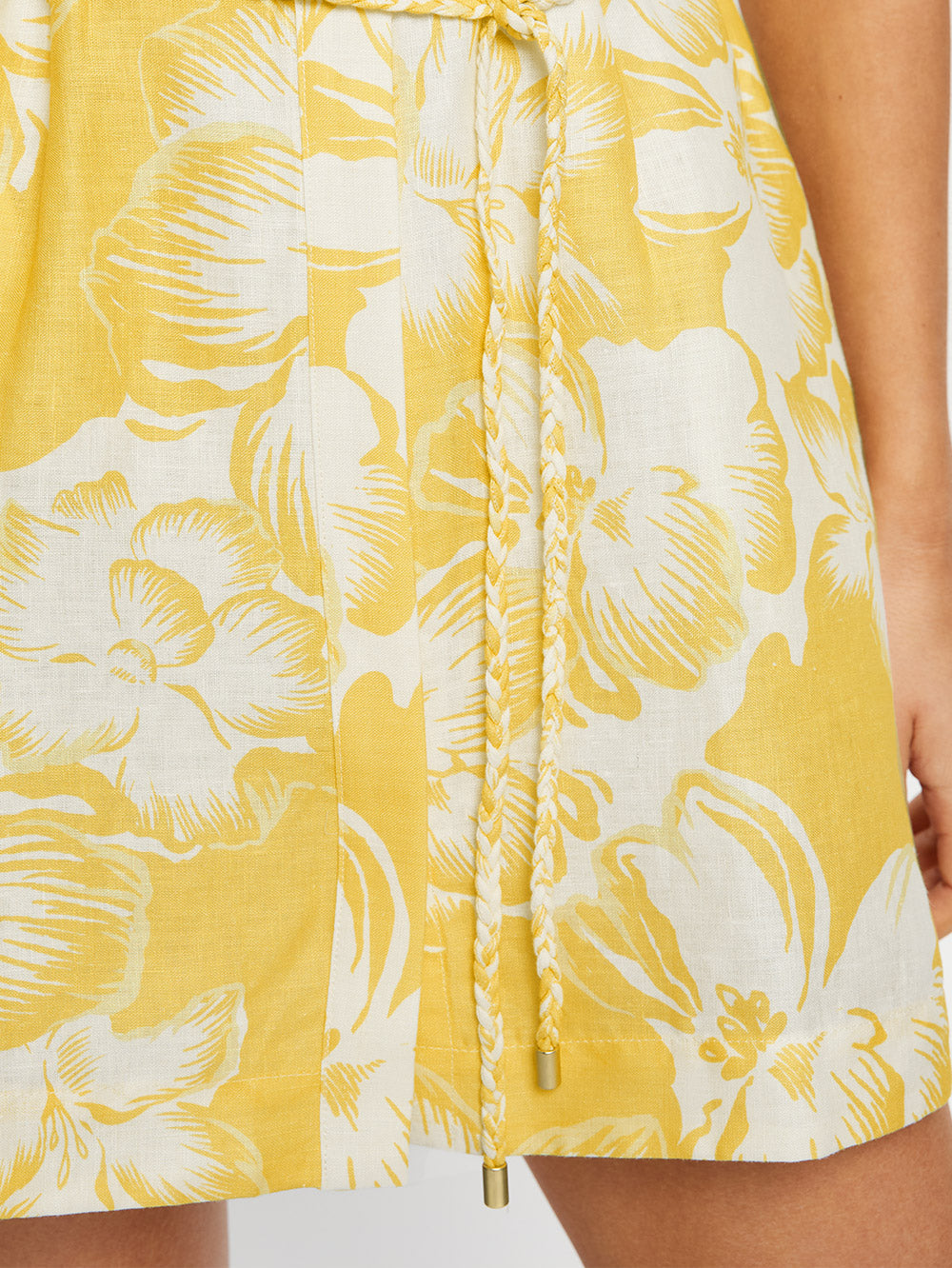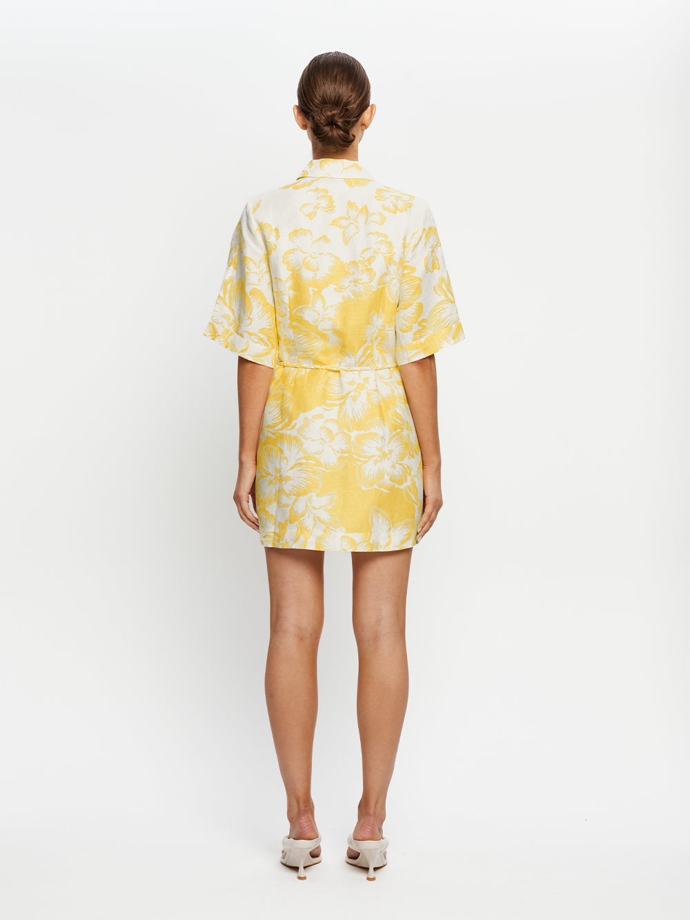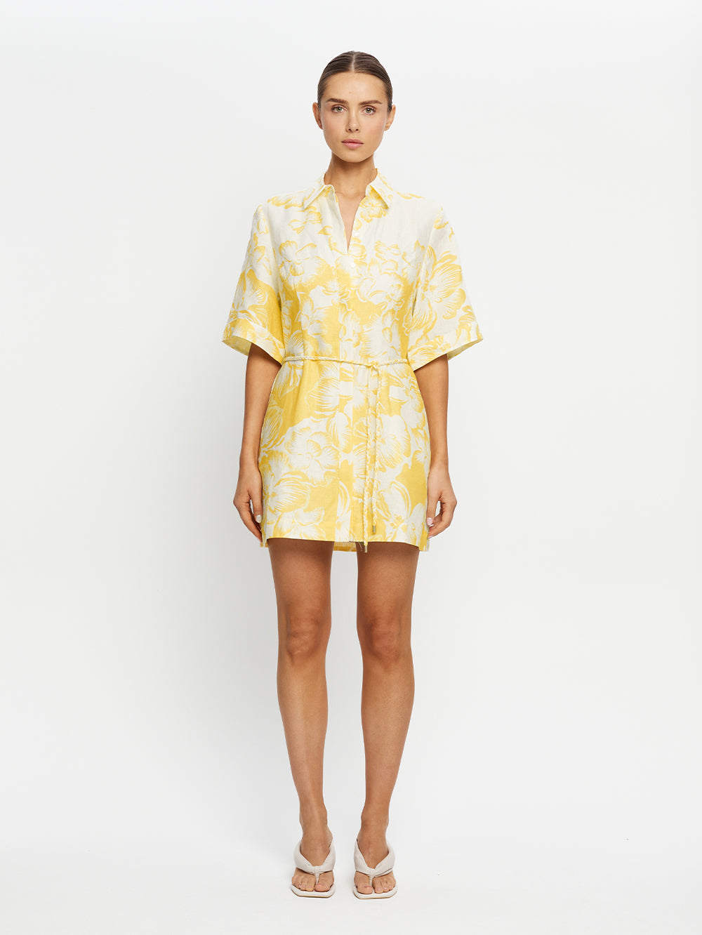Soraya is a vibrant yellow and white floral print, defined by oversized, abstract blooms. Soraya is vibrant yellow and white floral print with large, abstract flowers. The Soraya Mini Dress is a relaxed silhouette featuring kimono-style sleeves, a classic collar and a button-through front, complete with a removable waist tie for versatile styling. Style with sandals for sun-soaked weekends and long lunches