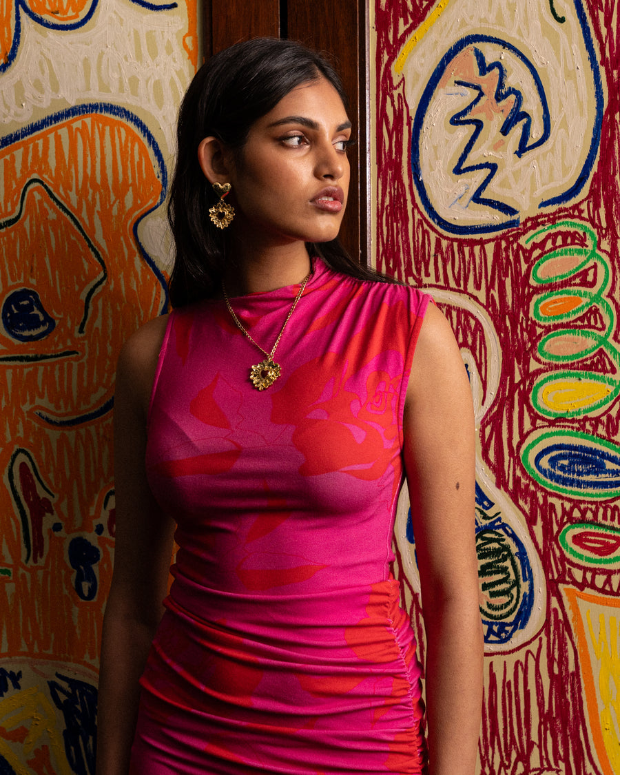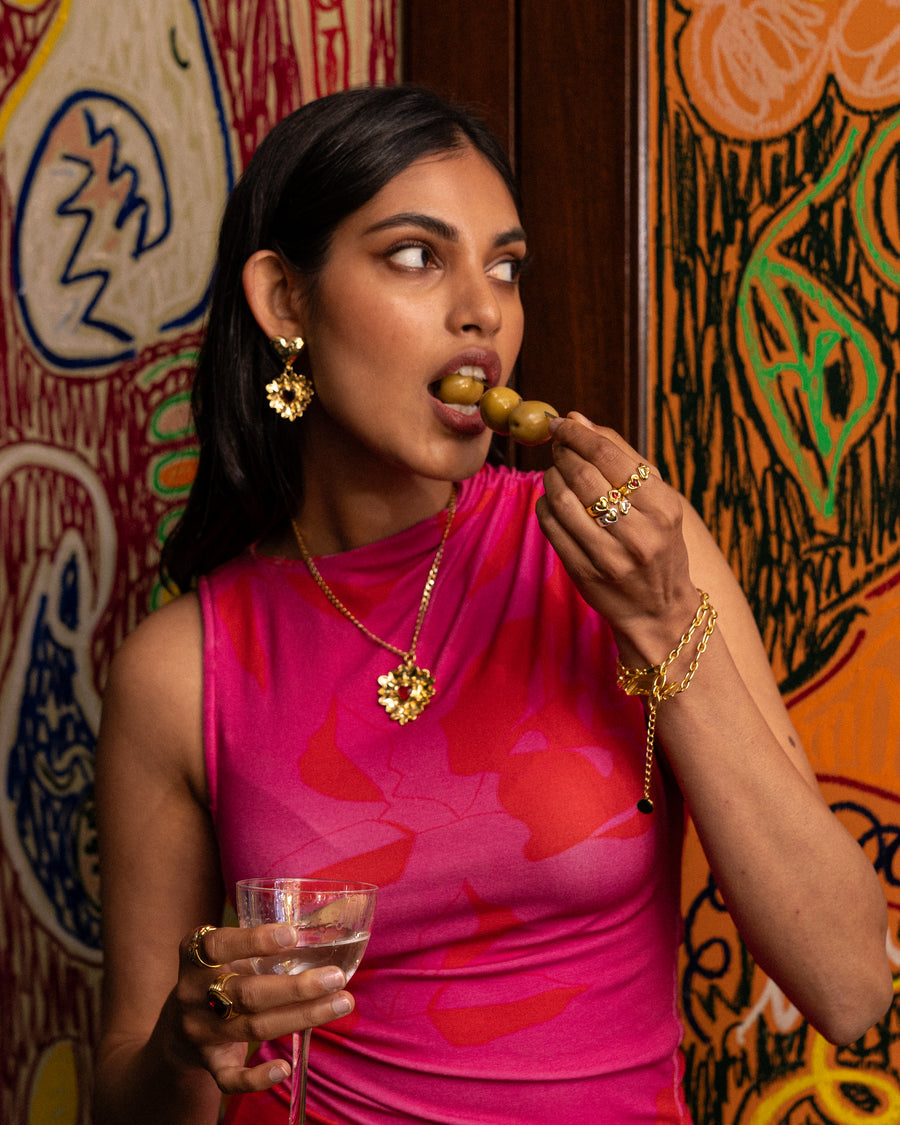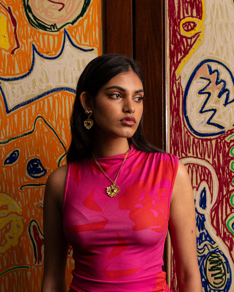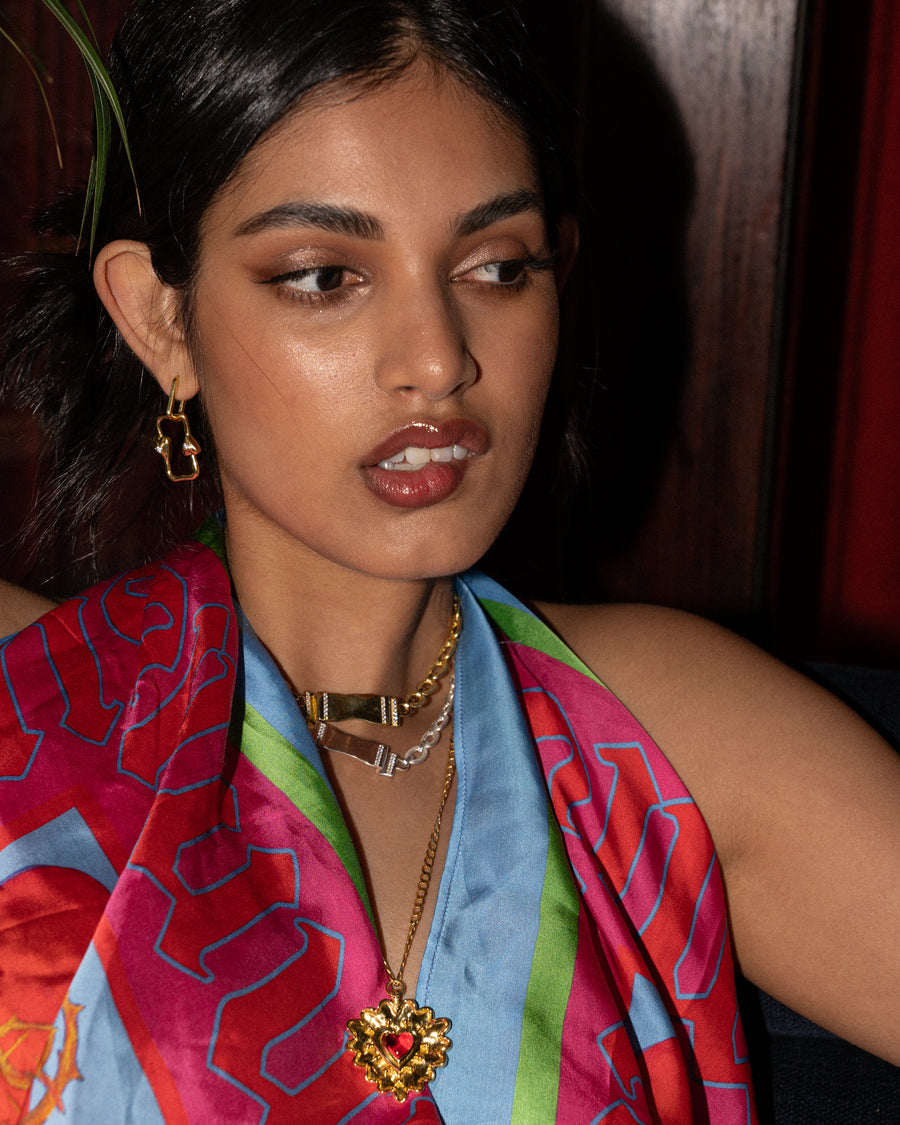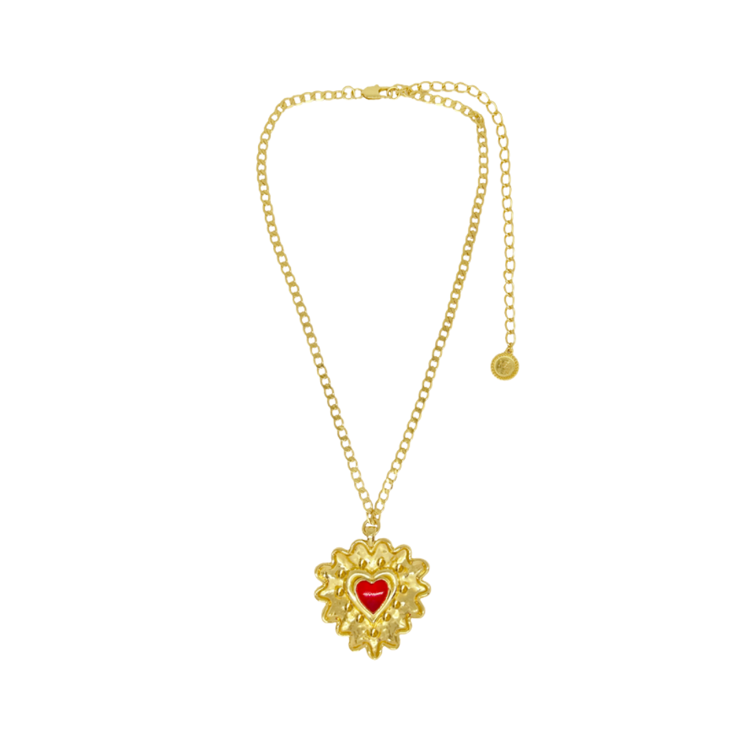 Fall in love with the divine Luciana Necklace. Inspired by the iconic flaming heart, this necklace features a gorgeous golden heart motif, intricately detailed and adored with the deepest of red stones. In our signature hammered texture with high polish inflections she is truly captivating. Pair her with the Cordelia Earrings for an indulgent matching set. The Luciana Necklace is perfect for adding a touch of romance and playfulness to any look. She is love at first sight!
