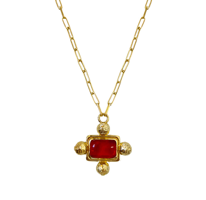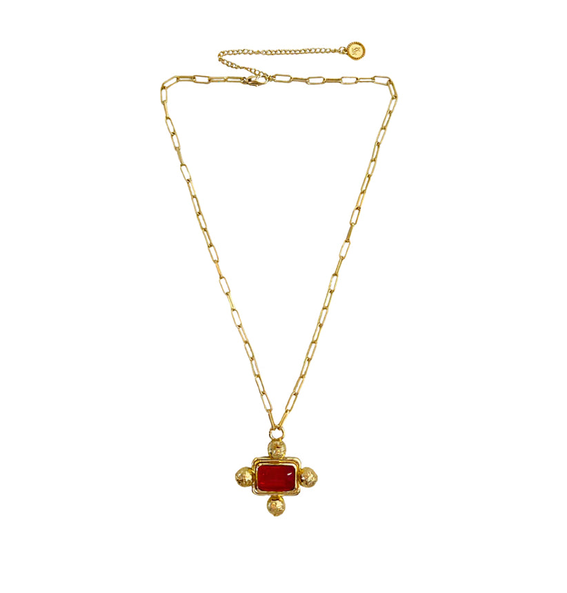 A little commotion for this icon... the YASMEEN Necklace. Inspired by the 90's supermodels who graced our runways, she is beautiful and bold! The Yasmeen was created to elevate and transform any look. A new motif to our collection featuring a chunky setting, this favourite hammered texture & a striking cabochon red glass stone that brings all the drama we love in a statement necklace. She can be worn long or short, each option offering completely different looks, which makes her very versatile. She is all glamour and will be a forever iconic piece in your jewellery collection.