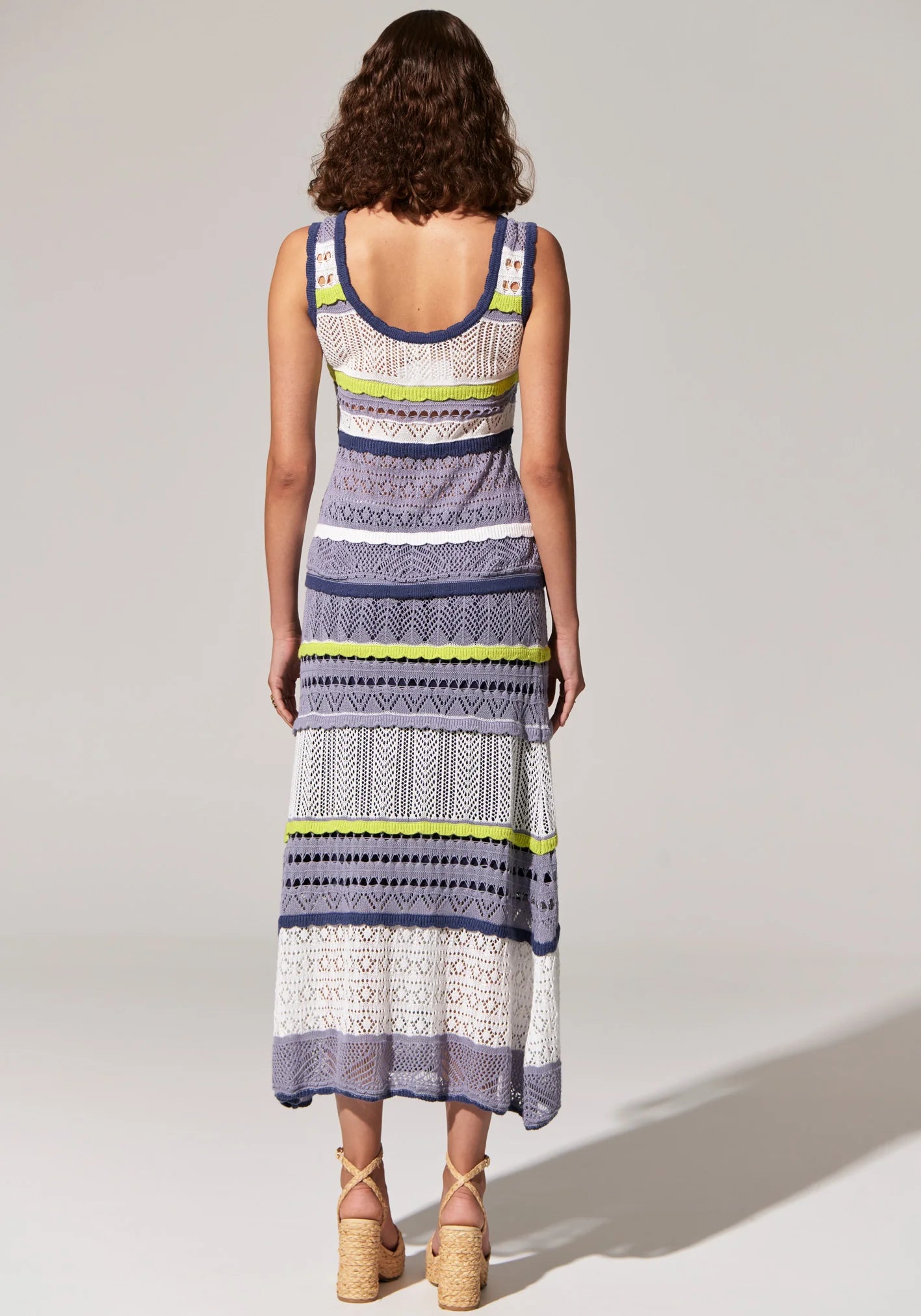 -Multiple pointelle stitch stripes with scalloped trim in shades of Light Blue, Mid Blue, White and Lime.