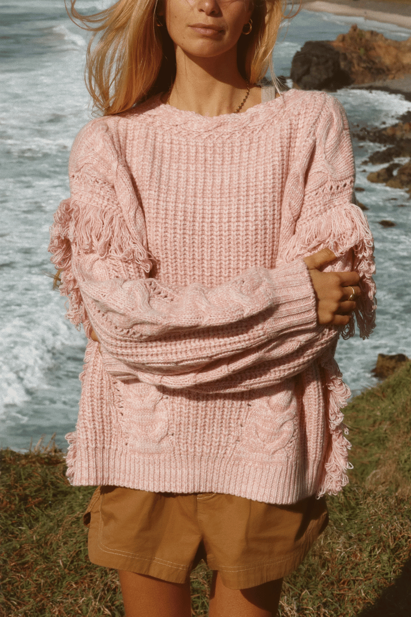 Stay comfy and stylish in our Nomadic Knit Jumper. The perfect mix of boho and urban, the boat neck features cable knit and fringing detail. Oversized for that effortless look, it's the perfect piece to add to your cozy weather rotation.