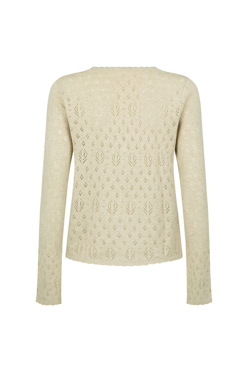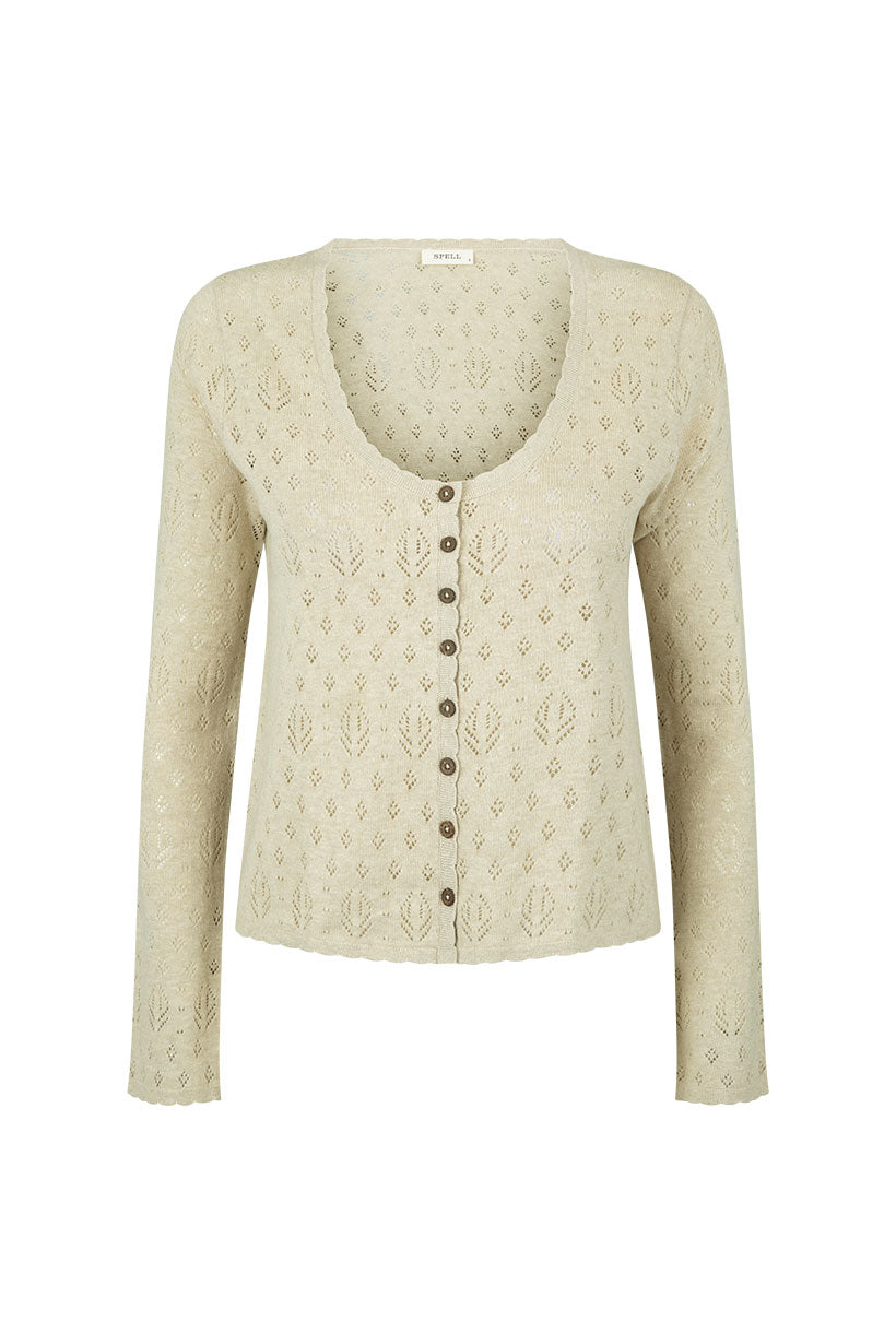 The Rhodes Knit Cardigan in Sand brings a playful twist to classic comfort. Made from a soft organic cotton linen blend, its pointelle knit and scalloped edges add a whimsical texture. Featuring a wide crew scoop neck and a charming coconut button at the center front, this boxy, unlined fit makes layering effortless and fun for any casual occasion.