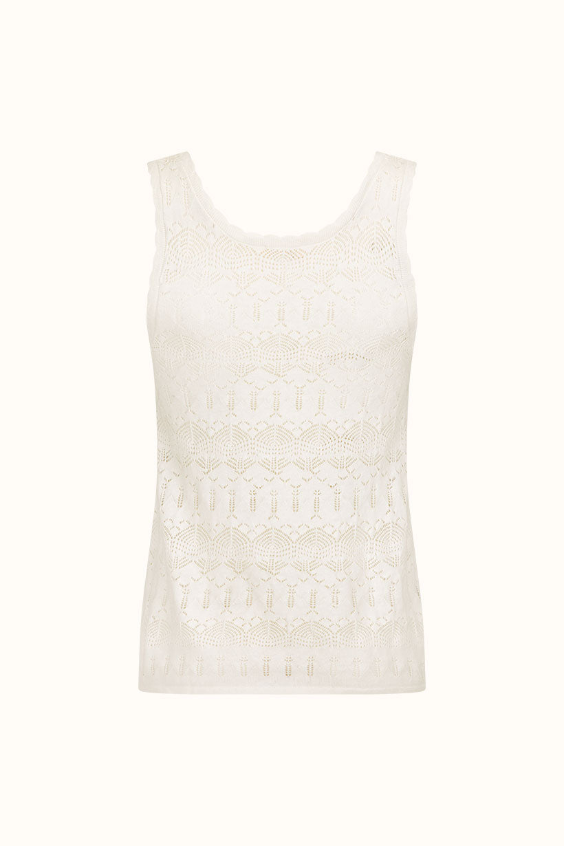 The Siesta Cami in White Sand is a statement piece. Made with an organic and recycled cotton blend with a touch of linen for structure. The scallop knit edge on the neck and armhole adds a delicate detail, while the fully fashioned knit pattern gives it a unique texture and look. Embrace your boho side and wear this cami with confidence!