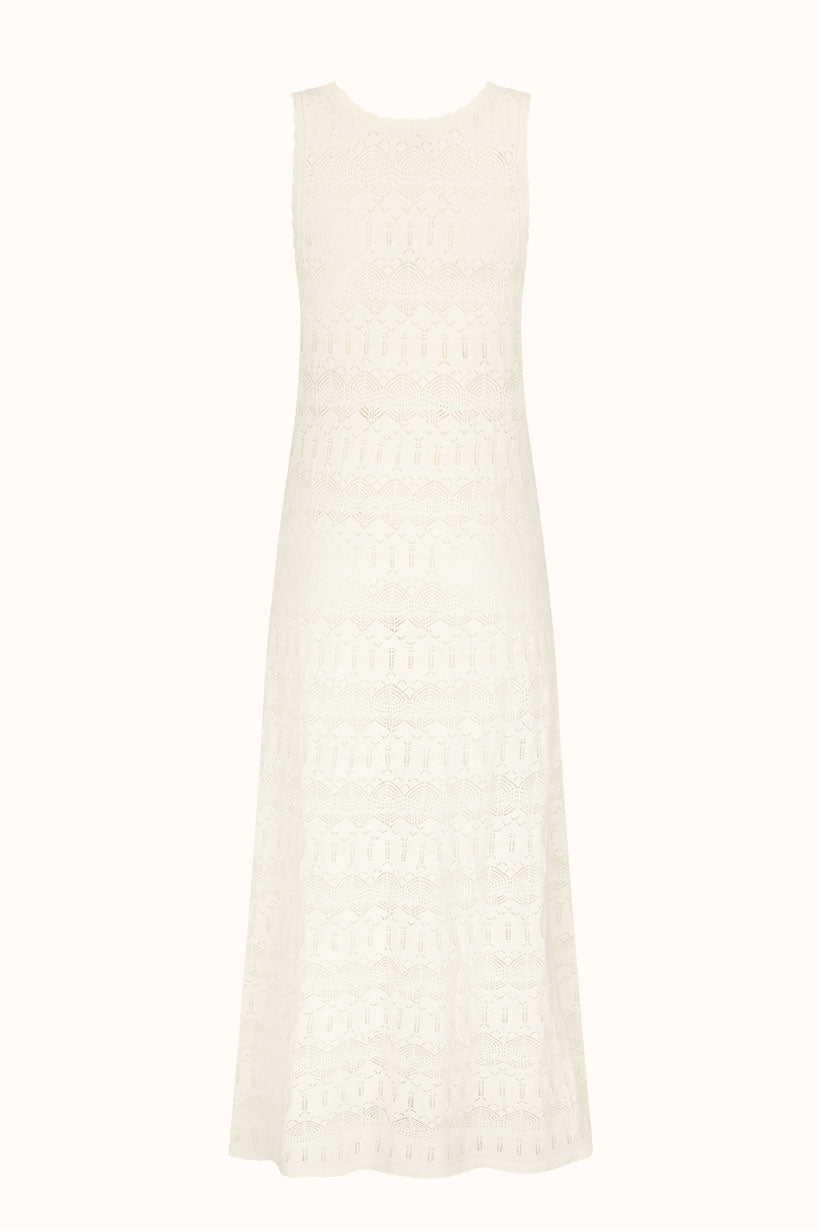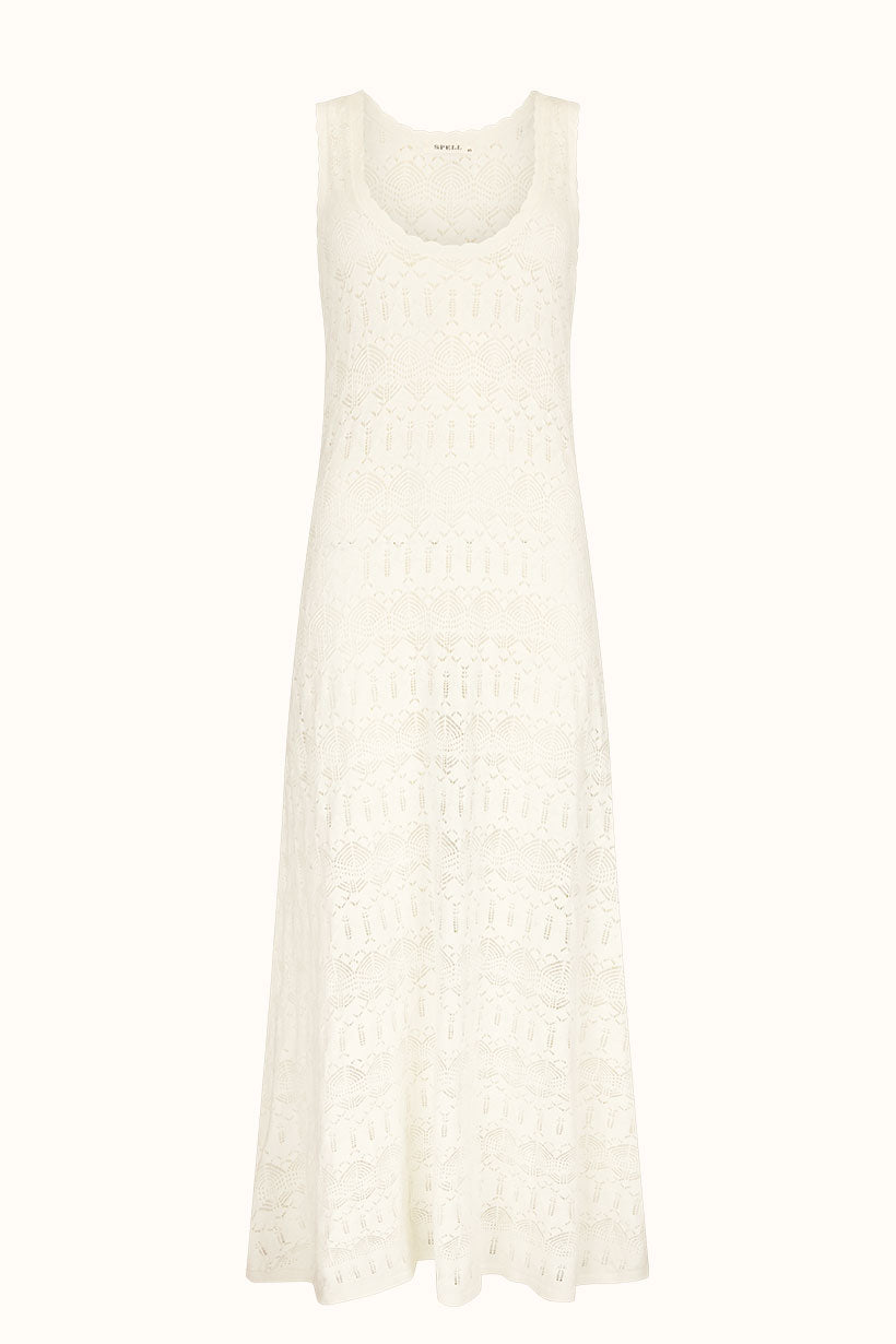 Embrace your bold and adventurous spirit in our Siesta Maxi Dress. Made with a sustainable blend of organic and recycled cotton and linen, its versatile, neutral hue will match back with any piece in your wardrobe. The intricate pointelle knit pattern and scallop knit edge add a touch of edginess to the elegant maxi length. Take the plunge and make a statement with this must-have piece!