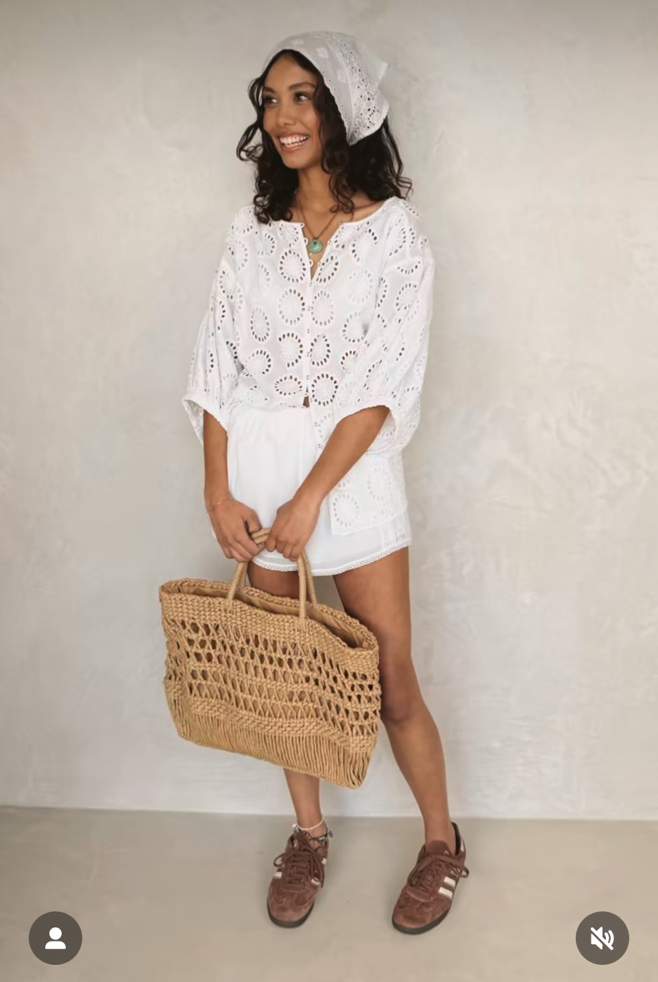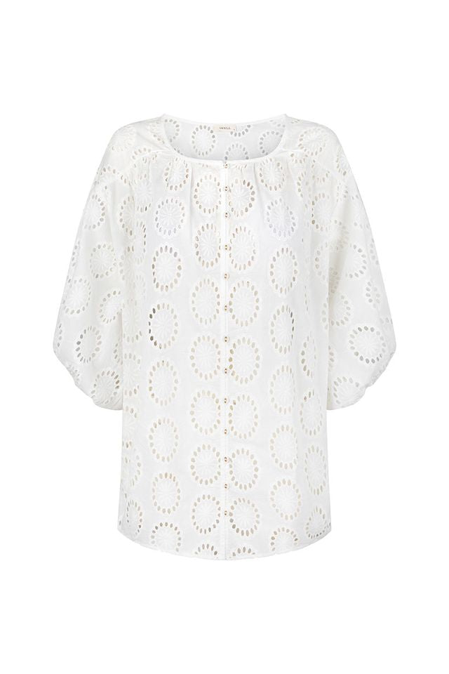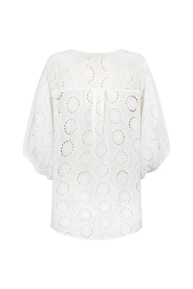 The Yaya Lace Blouse in Vintage White brings a playful, vintage charm to your wardrobe. Crafted from 100% organic cotton, its oversized fit and drop shoulders offer effortless comfort. Delight in delicate scallop lace fabric and intricate broderie anglaise details, finished with neat binding at the neck and sleeves. The classic button-front adds a sweet touch, perfect for mixing timeless elegance with a relaxed, modern vibe.