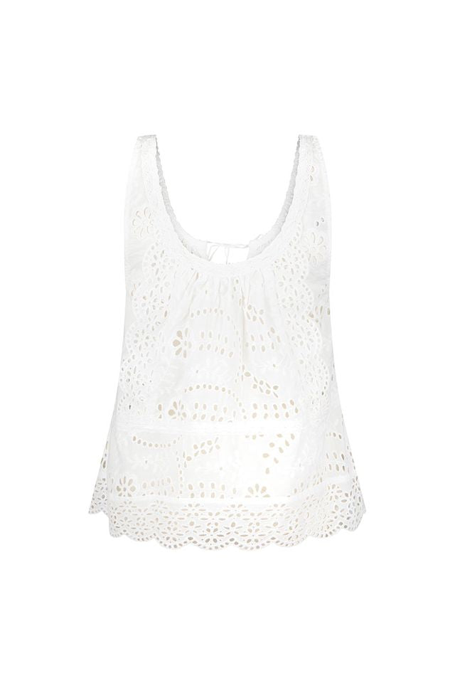 Elevate your look with the Yaya Lace Cami in Vintage White, crafted from 100% organic cotton for breathable comfort. Its delicate scallop lace fabric and broderie anglaise details add a soft, feminine touch. Adjustable ribbon ties on the neck and waist, finished with tassel accents, let you customize the fit while enhancing its playful charm. Perfectly unlined for effortless layering, this cami brings a flirty, vintage-inspired elegance to any outfit.