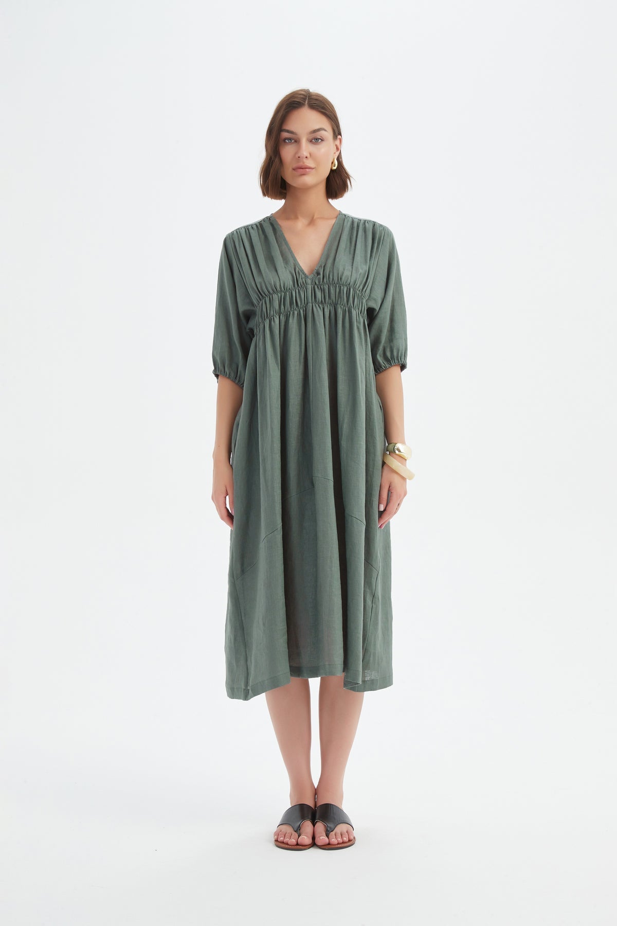 Relaxed and comfortable. Crafted from 100% French Linen, the Puff Sleeve Gather Front Dress features a demure v-neckline, gathered accents across the front, and puff sleeves. Light, relaxed, and perfectly refined, it’s an ideal companion for sunlit days and warm-season sophistication.